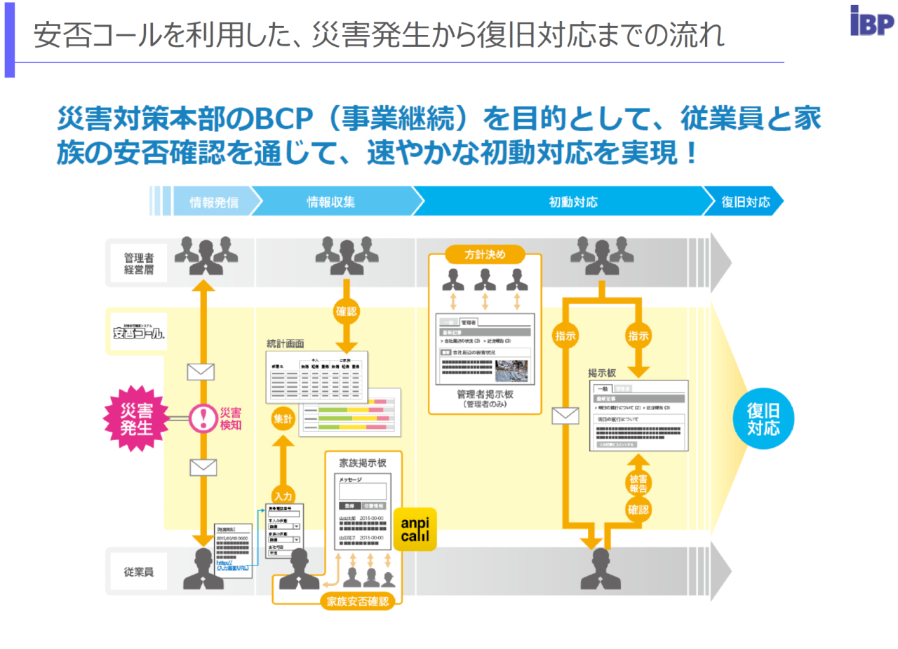 国内各地での大規模地震やゲリラ豪雨などの風水害が頻繁に発生する中、企業のBCPの意識も急速に高まっています。災害対策本部BCP(事業継続)を目的として、従業員と家族の安否確認を通じ、速やかな初動対応を実現させます!