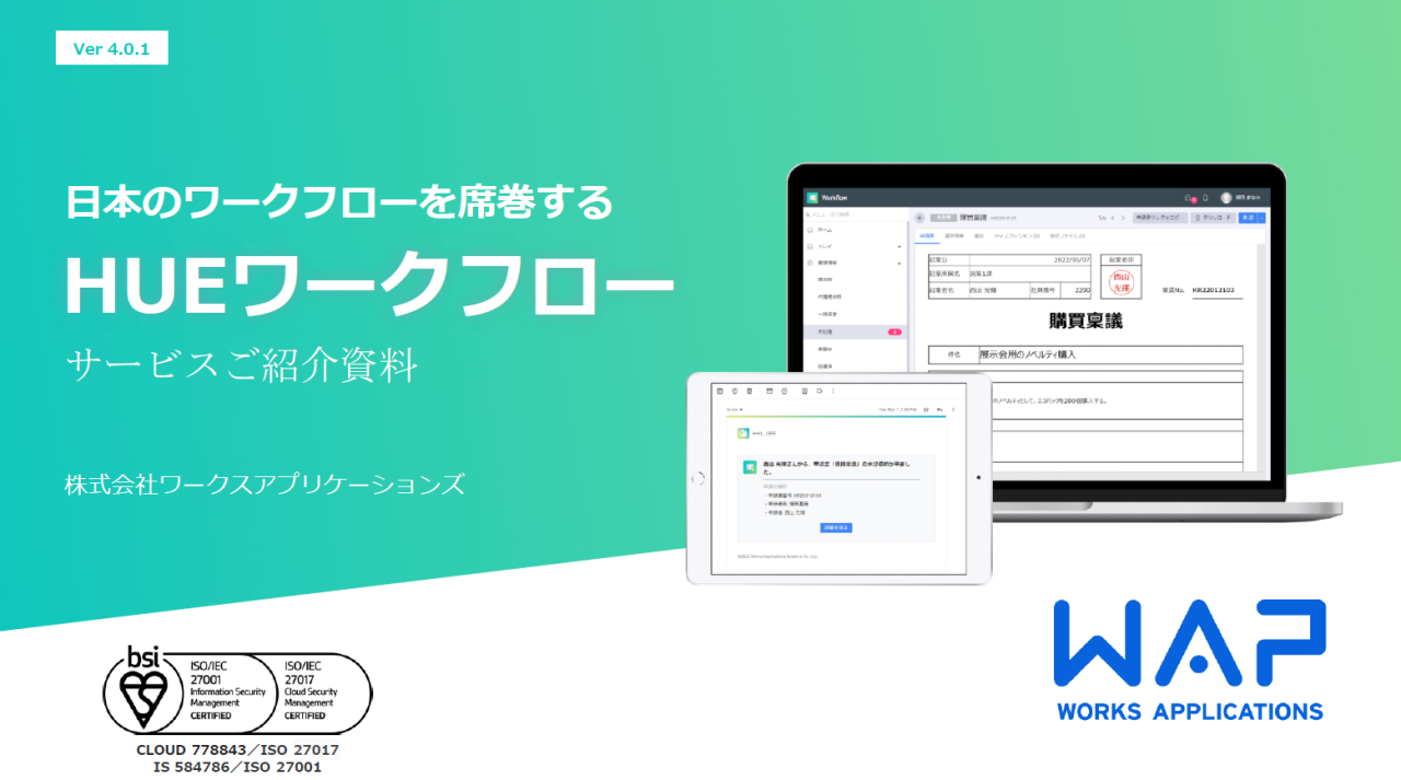 HUEワークフローは、ユーザー目線で「使いやすい」を追求した今までにないワークフローシステムです。申請・承認にとどまらない業務全体の効率化、DX推進の第一歩を支援し、企業価値の拡大に貢献します。