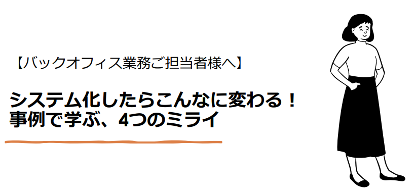 システム化したいけど、何から始めればいい?効果がすぐに出るシステムはどれ?システムに任せられるところは任せたい!バックオフィス部門だけでなく、お客様や従業員へのメリットがあるって本当?4つの事例で学びます!