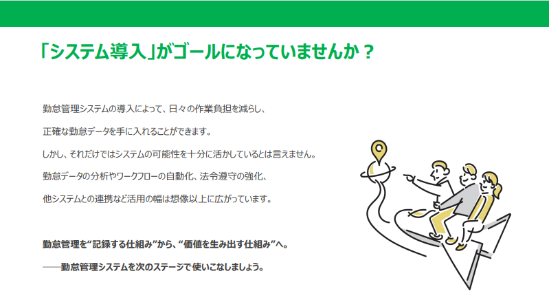 勤怠管理システムを入れて、ほっと一息。データを蓄積し、”記録する”だけでは、もったいない!法令遵守の強化やデータ分析、他システムとの連携など、幅広く活用できることをご存じですか?システム導入前のお客様も必見の資料です。