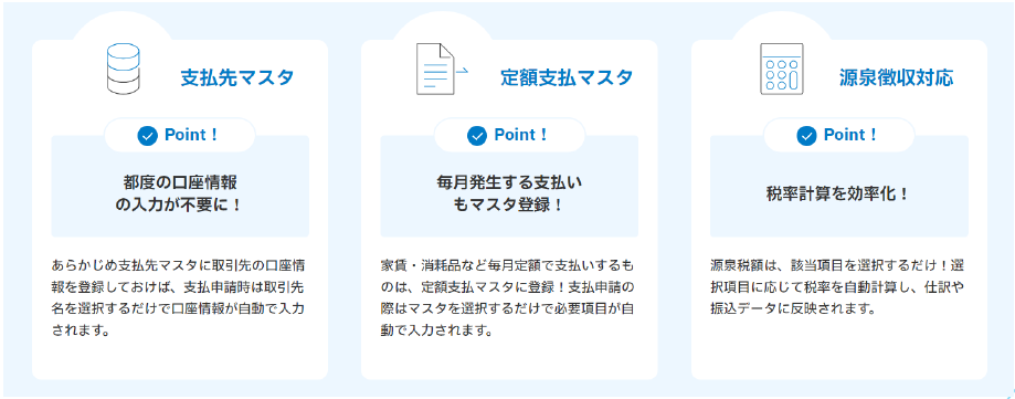 「楽楽精算」は、その後の支払依頼~振込データ作成までのひとつひとつの作業を、とことんラクにします。